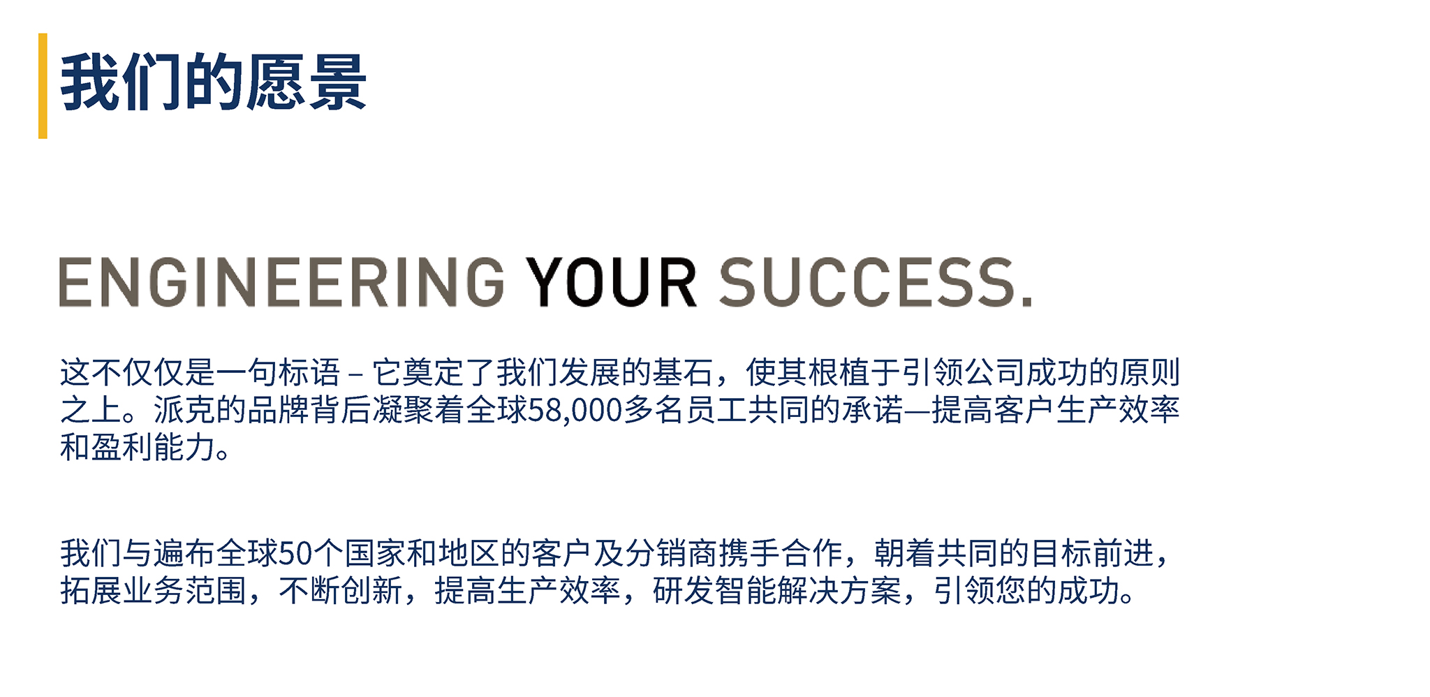 在派克,一切始于我们的客户,止于可量化的结果。“制胜战略”推动卓越的运营,将使派克能够跻身业绩前25%的多元化工业产品制造商之列,并为股东创造长期价值。